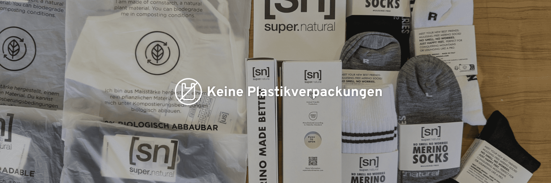 ✔ Verpackung ohne Plastik: Seit 2021 setzen wir für unsere Produkte auf zertifizierte, kompostierbare Polybags aus Maisstärke, die sich unter industriellen Bedingungen innerhalb von 180 Tagen zersetzen, ohne Rückstände. Ergänzend kommen papierbasierte Lösungen zum Einsatz, beispielsweise FSC-zertifizierte Schachteln für Unterwäsche und Papierbanderolen für Socken.